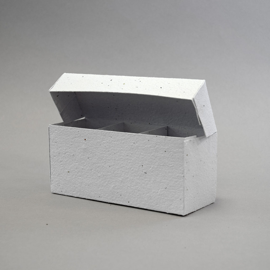 Nateva, a conçu et produit une ligne de packagings éco-responsables en papier ensemencé. Cette gamme est composée d’étuis, coffrets, soufflets, boîtes, sleeves. Leur design a été pensé pour optimiser la quantité de matériau et ne pas nécessiter de colle. L’ensemble des formats est certifié compatible avec le contact alimentaire.